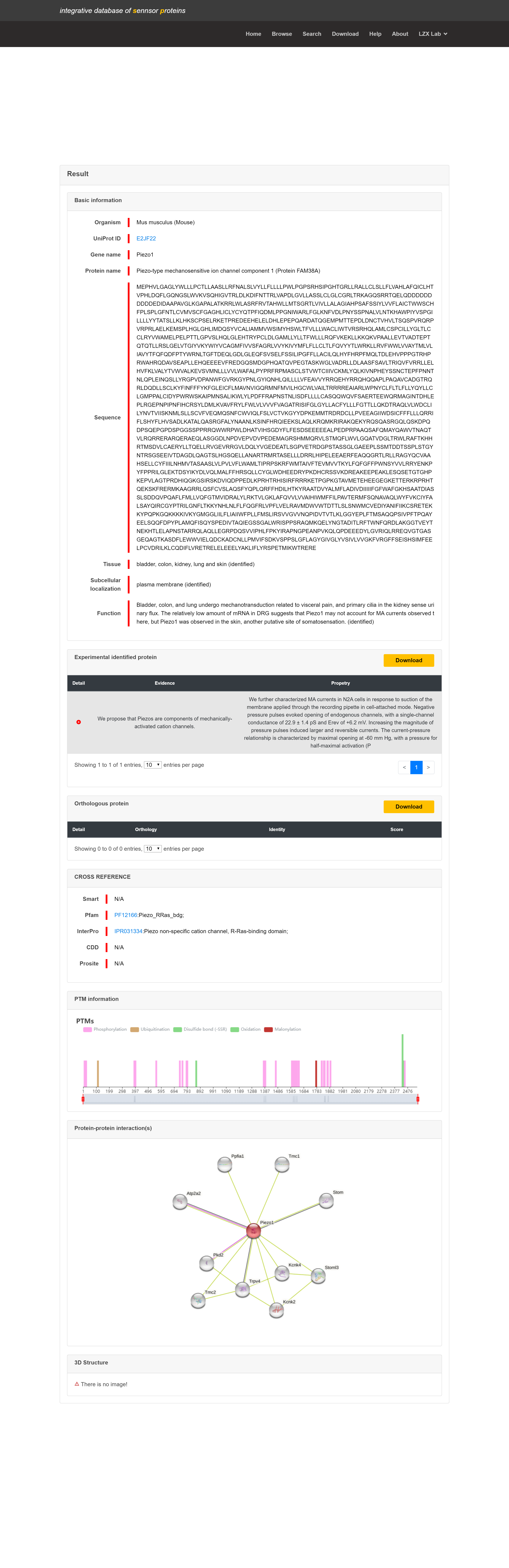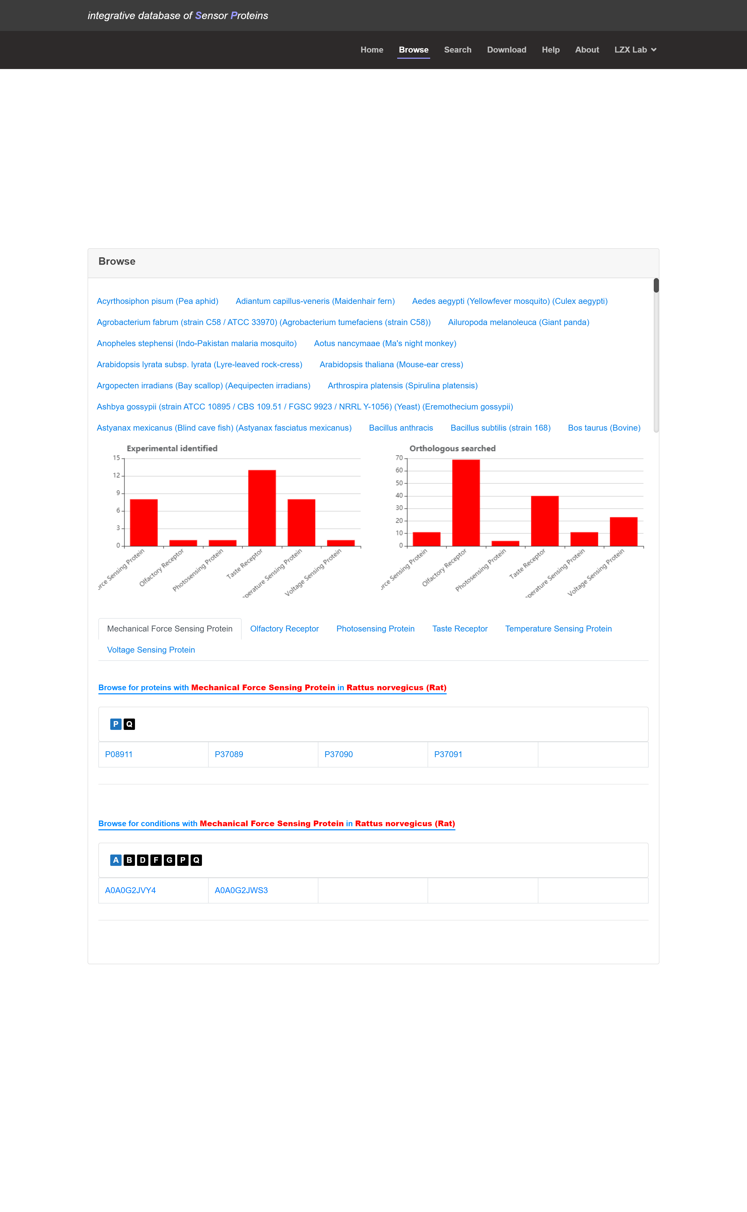 The dbSP is an integrative database of sensor proteins (SPs), which collected 399 literature and 2 datasets for 109 eukaryotic and prokaryotic sensing research. In total, 754 sensing events involving 7 sensing types on 712 SPs were collected and integrated in the database. By orthologous search, 477 orthologous proteins from 43 eukaryotes were obtained, with a total of 537 potential sensing events.